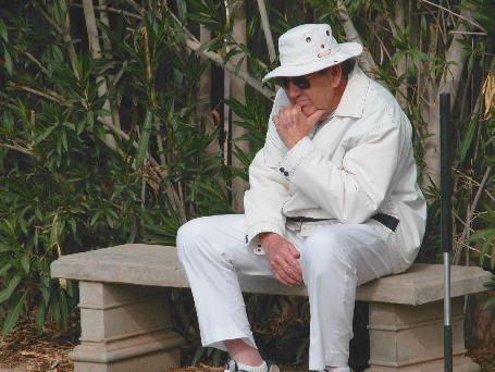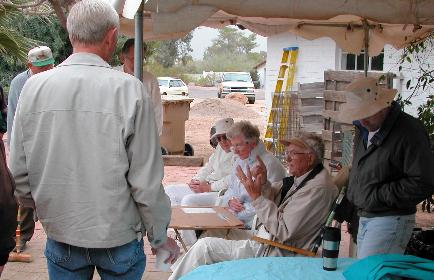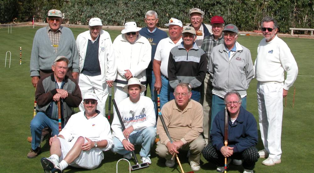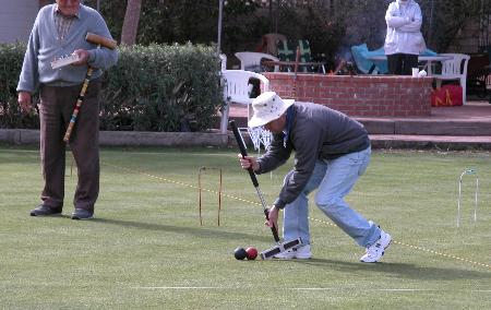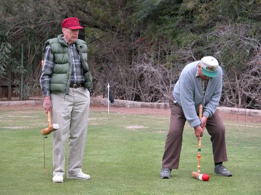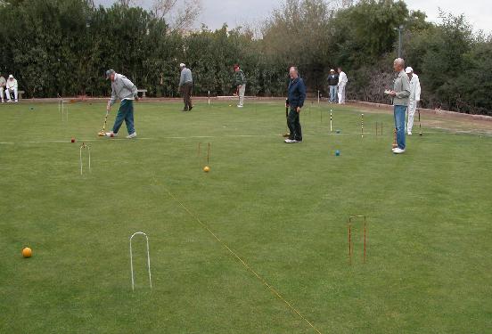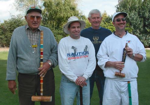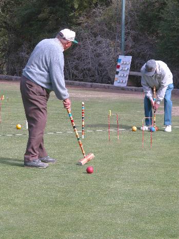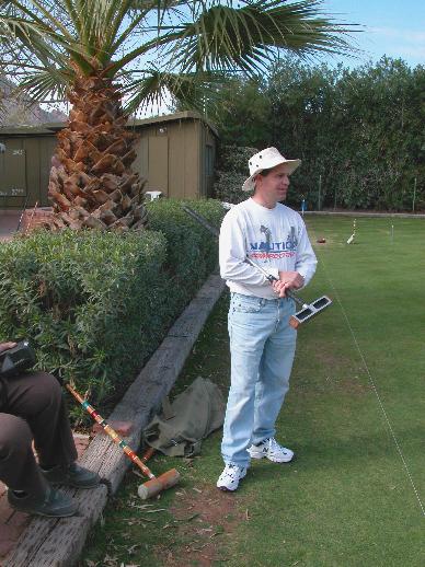 The Nine Wicket challenge is a great opportunity for two clubs to share their common interest in the sport of croquet. For the second year, Mesa's Venture Out club members have come to Scottsdale to play against members from the Arizona Croquet Club. We divide Ren Kraft's lawn into four (42'x52') lawns and the setup nine wicket layout. The equipment is provided by Venture Out. The tournament director was Arnie Pankow and ran a well organized event.Last year Venture Out got the upper hand, defeating Ray Hamm and John Fournier in the finals. This year, the ACC wanted to do better, but it wasn't an easy road. The courts were playing fast and it was easy to send a ball out of bounds when loading the outer hoops - these were only set in 1 yard from the boundary. (I am working on summarizing the rules since, although the similarities are quite striking, they are a bit different than Osborn's USCA version.)