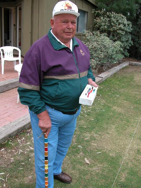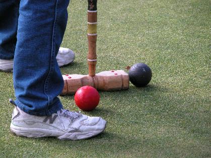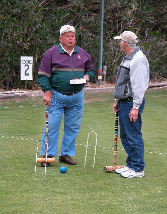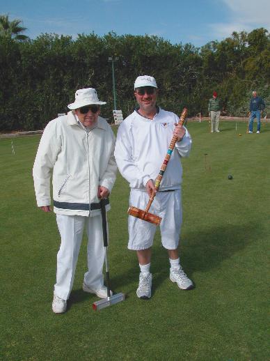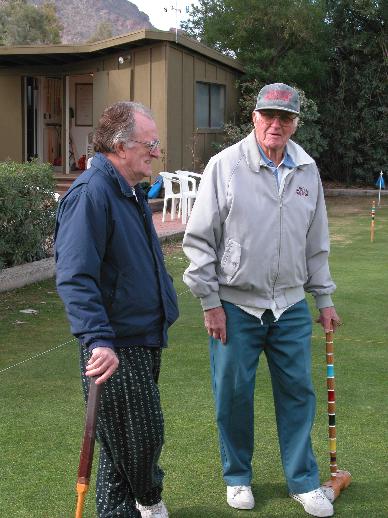 Rudy Pankow with mallet and deadness box. Pat Roach setting up his croquet shot.